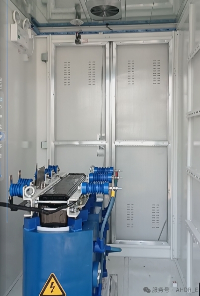 本項目包括箱式變電站及電力電纜。箱式變電站由高壓柜、低壓配電屏、配電變壓器及外殼四部分組成,變壓器選用干變,10kV高壓柜采用負(fù)荷開關(guān)設(shè)備。低壓主進(jìn)開關(guān)采用框架開關(guān),低壓、出線選用塑料外殼式開關(guān)。變壓器室采用單層通風(fēng)結(jié)構(gòu),門板設(shè)有防雨的百葉窗,變壓器室內(nèi)設(shè)有溫控風(fēng)冷系統(tǒng),采用變壓器專用節(jié)點式壓力溫度計,方便觀察變壓器室溫度。針對現(xiàn)場環(huán)境特點,特別設(shè)計了防護(hù)過濾網(wǎng),運輸時全封閉,到達(dá)現(xiàn)場后可拆卸面板進(jìn)行通風(fēng)、防塵、防小動物等,有效適應(yīng)各種復(fù)雜環(huán)境。