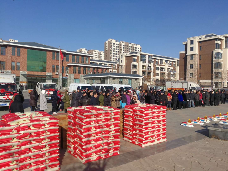2018年1月23日,滿載大米、面粉和豆油的八輛大卡車,在集團于寶權董事長帶領下,直赴營口市西市區(qū)得勝街道紅運社區(qū)廣場,為等候在這里的500戶貧困居民每戶發(fā)放一袋大米、一袋面粉和一桶豆油,表達中天人的愛心,這是中天集團持續(xù)九年的善舉。