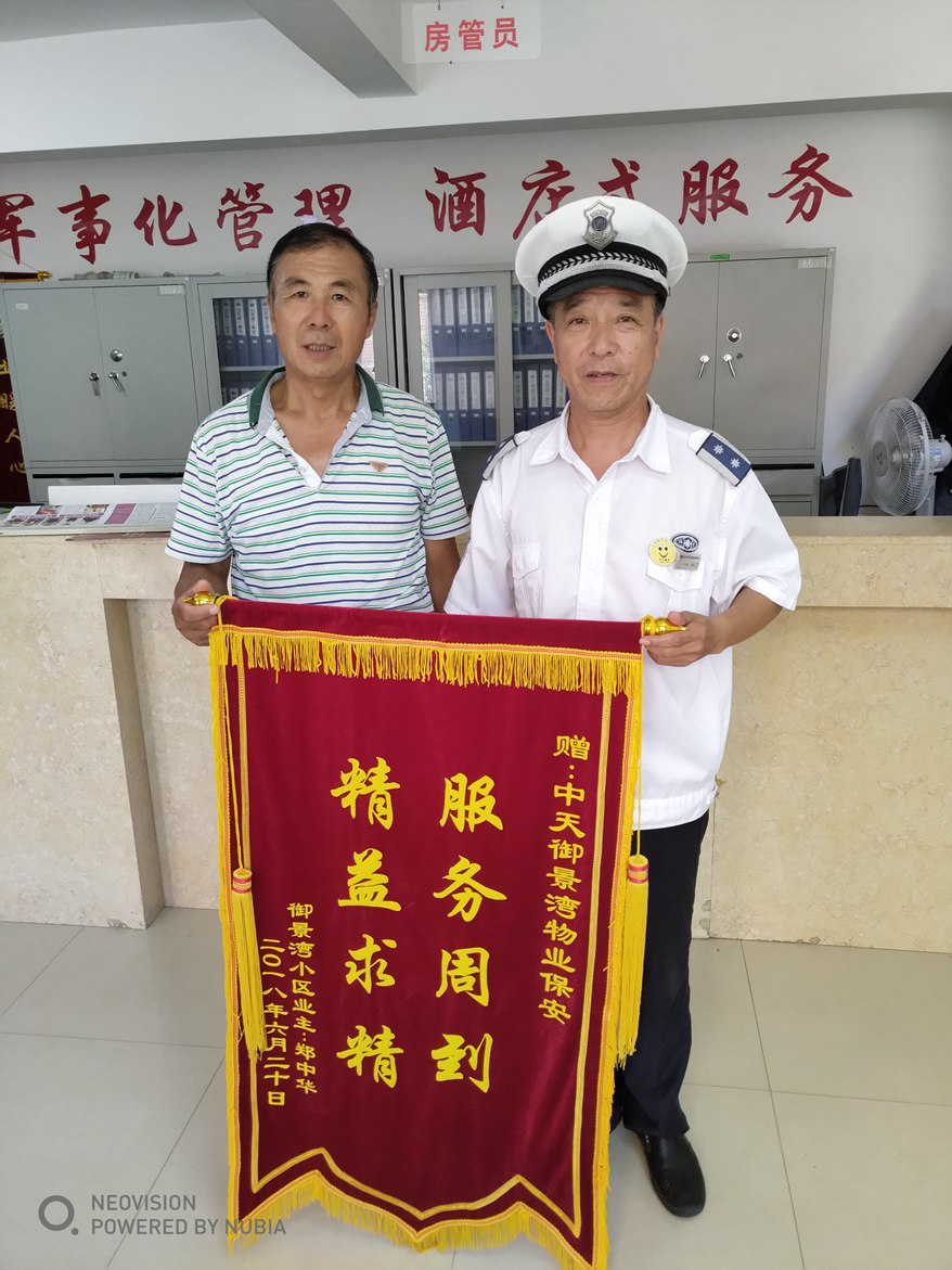 6月27日上午,御景灣小區(qū)13號樓業(yè)主鄭中華將一面寫有“服務(wù)周到,精益求精”的錦旗送到了物業(yè)辦公室。原來是一天晚飯后其患有精神疾病的孩子在園區(qū)遛彎時,不慎丟失,來尋求物業(yè)幫助時,當(dāng)班班長楊世民見情況緊急,一邊安慰他,一邊安排各崗保安注意觀察出入人員,并調(diào)取監(jiān)控錄像尋找,并組織物業(yè)員工在孩子有可能出現(xiàn)的地方開展地毯式搜索,最終在晚上10點多鐘,在園區(qū)半地下車庫一個角落里發(fā)現(xiàn)了走失的孩子。