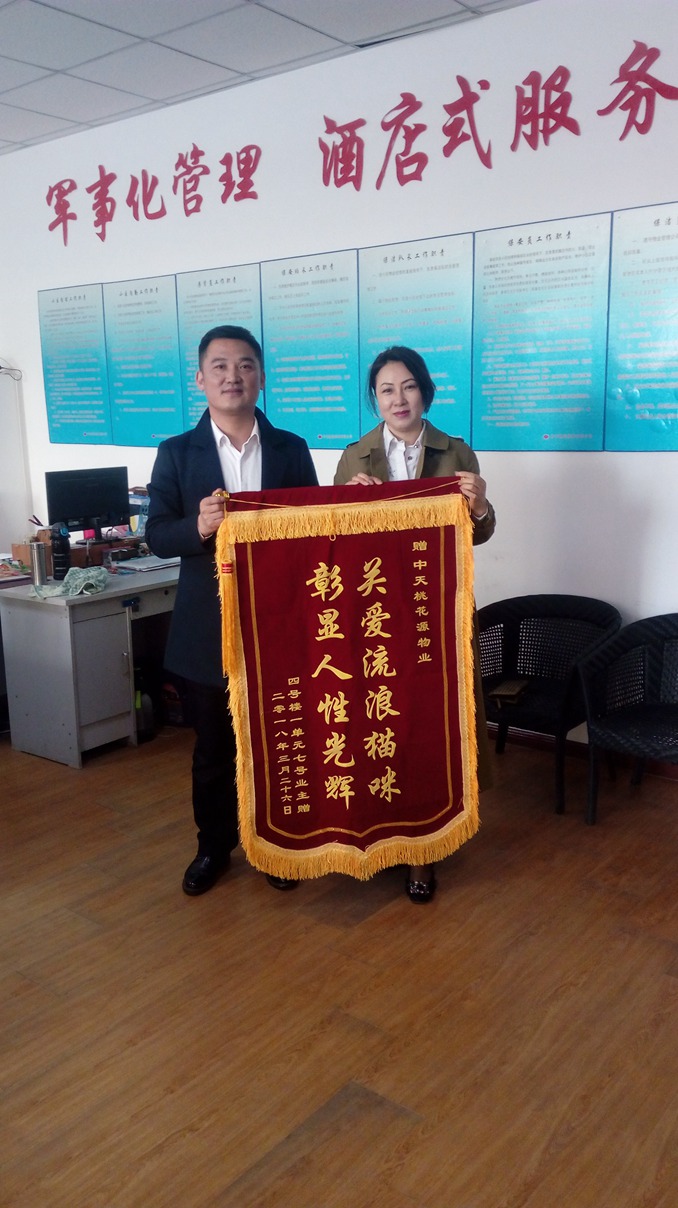 3月26日上午,桃花源小區(qū)4號樓業(yè)主送來一面錦旗,上面寫著“關(guān)愛流浪貓咪,彰顯人性光輝”。原來這位業(yè)主非常關(guān)愛小區(qū)流浪貓,她自費購買貓糧,在地下室角落每天投放。而我們的物業(yè)保潔不僅沒有驅(qū)逐流浪貓,還主動幫助打掃喂食的地方,這份善意讓業(yè)主感動。