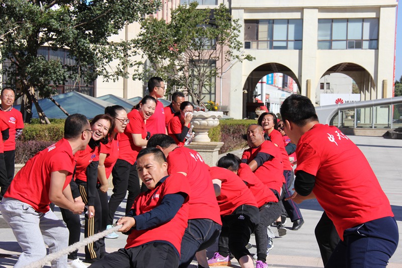 伴隨著于總一聲令下,比賽正式開始。本屆運(yùn)動(dòng)會(huì)共設(shè)5個(gè)團(tuán)體項(xiàng)目,包括拔河、二人三足跑、齊心協(xié)力、海底撈月和激情傳遞。首先進(jìn)行的是拔河比賽,各代表隊(duì)分別派出10名選手參賽。隨著裁判員哨音響起,鑼鼓聲、吶喊聲響成一片,每一組比賽都在愉快的笑聲和遺憾聲中結(jié)束。經(jīng)過激烈角逐,萬豪酒店和機(jī)關(guān)二隊(duì)進(jìn)入了最后的決賽。萬豪酒店是上屆拔河比賽的冠軍,機(jī)關(guān)二隊(duì)的實(shí)力也是非常強(qiáng)勁,每一局比賽雙方都會(huì)反復(fù)拉鋸,在一片吶喊和力量的較量后,最后,萬豪酒店取得拔河賽冠軍,衛(wèi)冕成功。