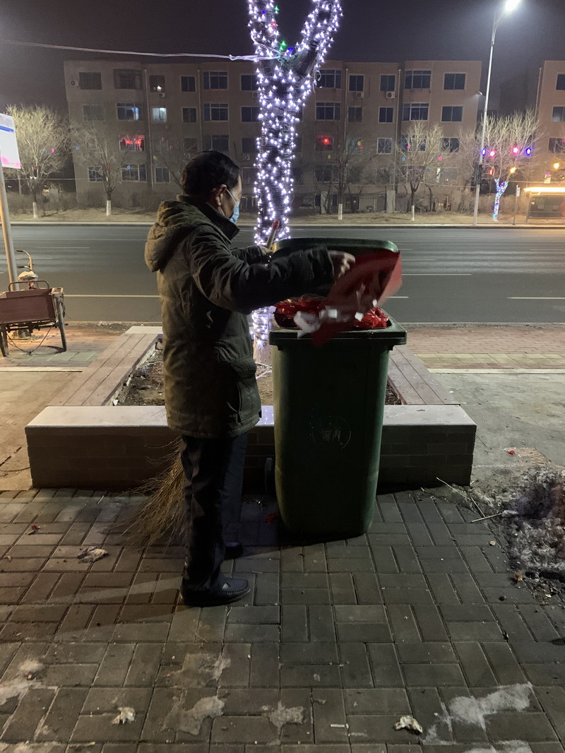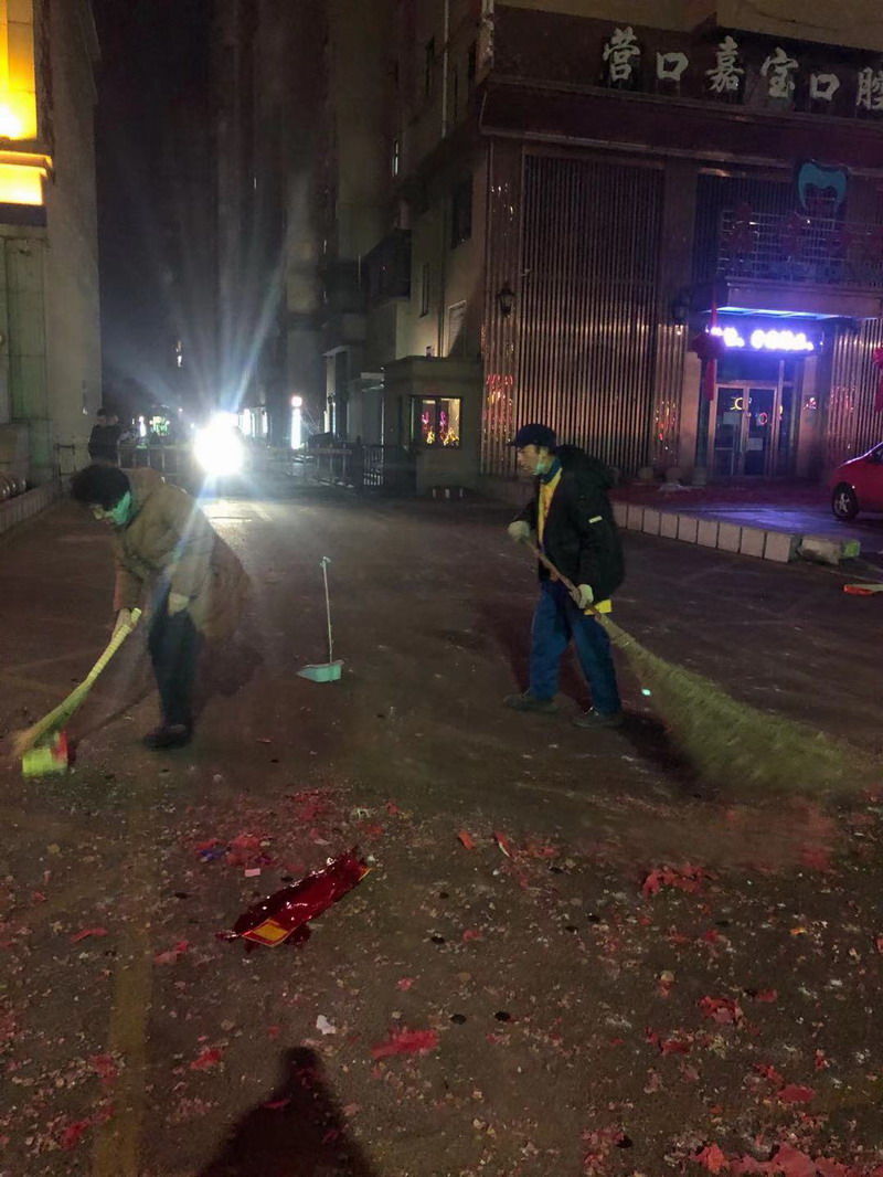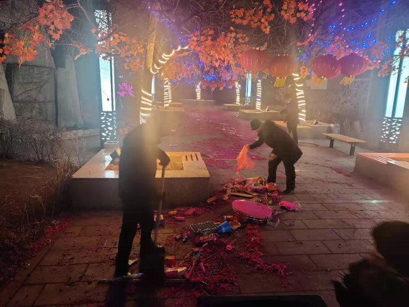 除夕夜燃放煙花爆竹是春節(jié)慶祝的方式,晚上十點,是物業(yè)人的集結(jié)令,當大家都沉浸在過年的闔家歡樂的喜慶氛圍中,中天物業(yè)全體員工卻投入清掃的崗位中,是他們將轄區(qū)燃放的爆竹紙屑清掃的一塵不染。凡是有鞭炮紙屑的地方就有我們物業(yè)人的身影,微笑著穿梭在轄區(qū)的各個角落,他們彎身弓腰、揮掃裝袋。當業(yè)主們初一清晨走入園區(qū)時,映入眼簾的仍然是干凈、整潔、安全的社區(qū)環(huán)境。