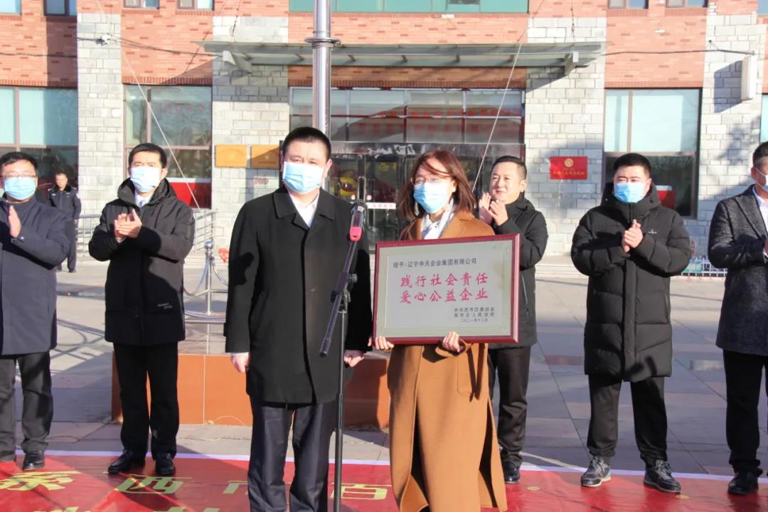 為表彰中天集團長期以來積極投身公益事業(yè),熱心扶貧幫困的善舉,營口市西市區(qū)委、區(qū)政府向中天集團授予“踐行社會責(zé)任、愛心公益企業(yè)”榮譽稱號,西市區(qū)委書記韓丹根親自為于洪波總裁授匾。