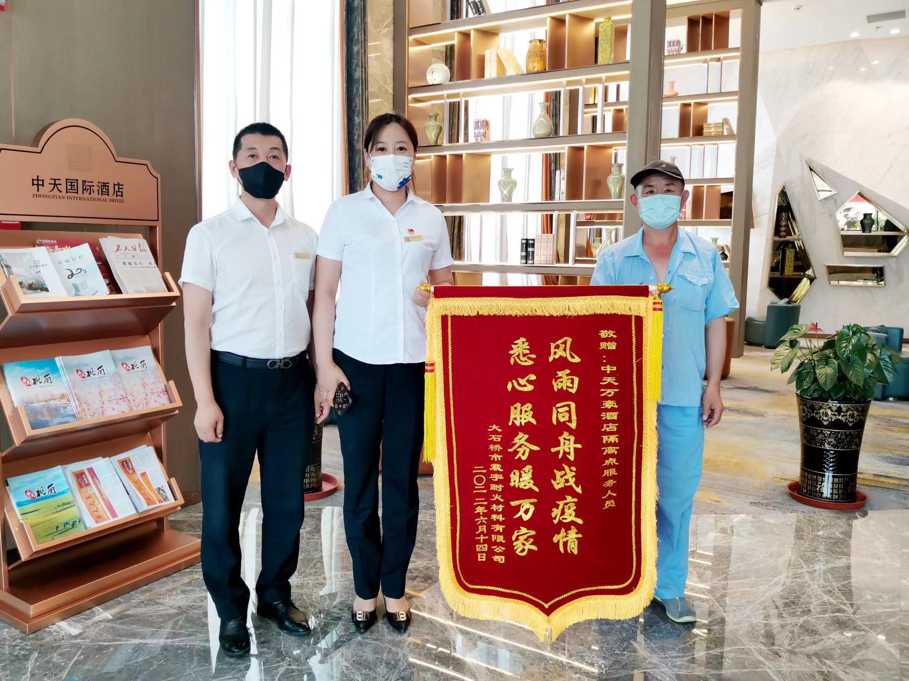 酒店公司作為疫情防控的最前線,肩負起隔離點的重任。大家義無反顧穿起隔離服,舍小家顧大家,堅守崗位,越是艱險越向前,不辭辛苦,不分晝夜,逆風而行。24小時值守,配送三餐,整理消殺,熱情服務,與高風險“面對面”,與隔離人員“心貼心”。一名隔離人員在感謝信中說:雖然我看不清你們的臉,但我感受到了真正的“暖”。封控不封愛,隔離不隔心,中天酒店人勇敢地“逆行”站到防疫的前線,圓滿完成了隔離任務,也收獲了社會的認可與點贊。