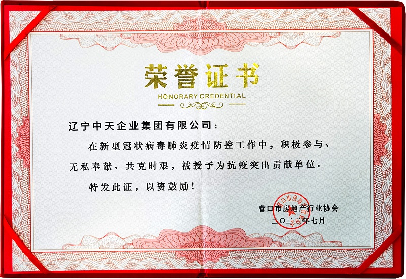日前,營口房地產(chǎn)行業(yè)協(xié)會授予中天集團“在新型冠狀病毒肺炎疫情、攻克時艱,為抗疫突出貢獻單位”稱號,頒發(fā)榮譽證書和紀念牌匾,防控工作中,積極參與、無私奉獻表獎中天集團所作出的貢獻。今年疫情發(fā)生以來,集團特別捐贈50萬元,并多次向社區(qū)一線送去慰問物質(zhì),同時,集團所屬各物業(yè)各小區(qū)、中天酒店、中天農(nóng)貿(mào)市場等全方位為抗疫保障服務,充分發(fā)揮了一個企業(yè)的擔當作用,為全社會抗擊疫情做出了貢獻。