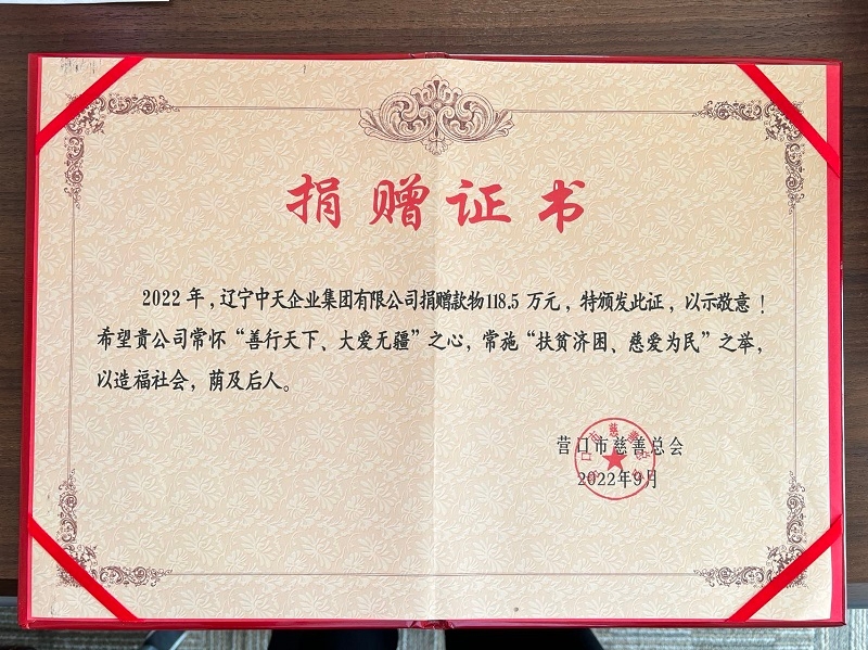 2022年,由于營口地區(qū)發(fā)生了新冠疫情,中天集團(tuán)加大了愛心慈善捐助力量,先后兩次為營口慈善總會捐款90萬元,疫情期間捐贈抗疫物質(zhì)折合人民幣近10萬元,同時,繼續(xù)啟動“中天助學(xué)金”和“中天愛心物資發(fā)放”兩大愛心項目,為31名貧困家庭考入大學(xué)的學(xué)生捐資15.5萬元,為600戶貧困居民送去米面油折合人民幣10萬元,持續(xù)做好“獻(xiàn)愛心做慈善”的活動。