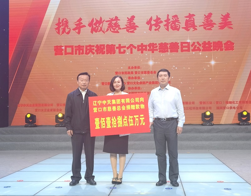 2022年9月27日,營口市慈善總會在營口新聞傳媒中心壹號演播大廳舉辦第七個“中華慈善日”晚會。晚會現(xiàn)場,總裁于洪波代表中天集團(tuán)向營口慈善總會捐款捐物118.5萬元。