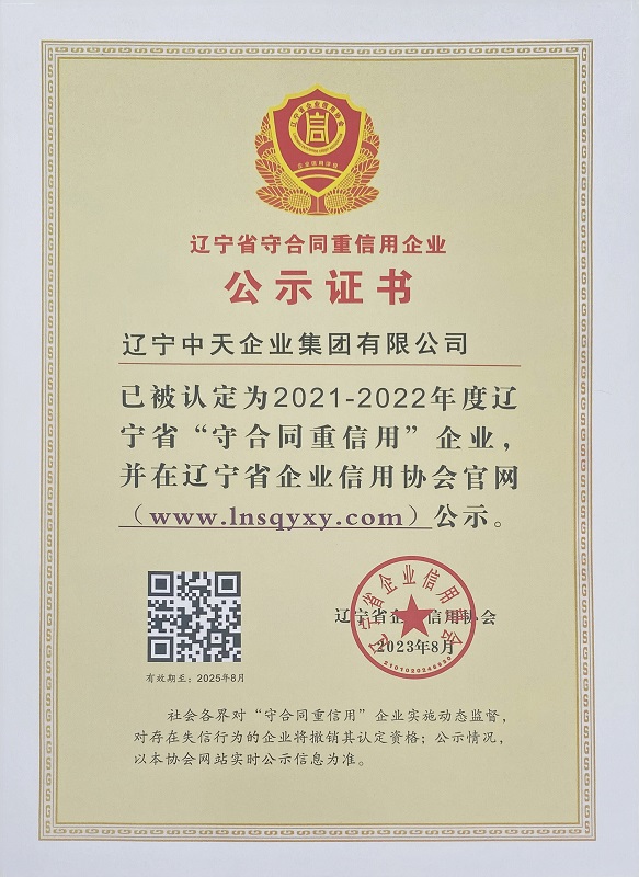 2023年8月,集團(tuán)被遼寧省企業(yè)信用協(xié)會(huì)認(rèn)定為2021-2022年度遼寧省“守合同重信用”企業(yè)和信用等級(jí)5A級(jí)企業(yè),這是中天企業(yè)集團(tuán)自2005年以來(lái),連續(xù)第19年獲此殊榮,既是對(duì)我們過(guò)去經(jīng)營(yíng)中取得成績(jī)的肯定,也是對(duì)我們今后經(jīng)營(yíng)和發(fā)展中所給予的希望和所提出的要求。中天企業(yè)集團(tuán)成立至今,始終以“誠(chéng)信為本,服務(wù)至上”為經(jīng)營(yíng)理念,在企業(yè)發(fā)展中,將誠(chéng)信貫穿經(jīng)營(yíng)以及對(duì)客戶服務(wù)的全過(guò)程,把誠(chéng)信作為企業(yè)的創(chuàng)業(yè)之本,立業(yè)之基。未來(lái),我們將矢志不渝的堅(jiān)持用誠(chéng)信打動(dòng)客戶,以誠(chéng)信塑造品牌,打造誠(chéng)信企業(yè)品牌。