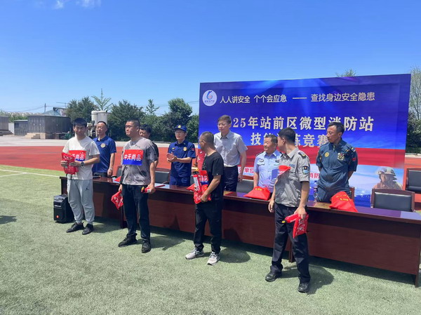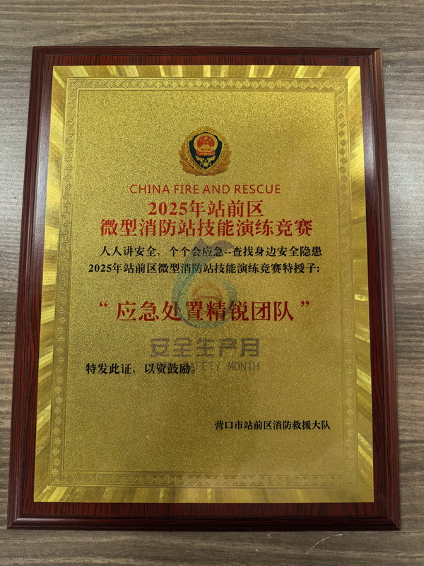 競(jìng)賽緊扣實(shí)戰(zhàn)需求,設(shè)置水槍水帶連接賽、傷員擔(dān)架救援賽、防護(hù)裝備穿戴賽、滅火器識(shí)別選擇賽、消防知識(shí)挑戰(zhàn)賽等五個(gè)比賽項(xiàng)目,全面檢驗(yàn)選手的體能、技能和團(tuán)隊(duì)協(xié)作能力,充分展現(xiàn)現(xiàn)代化救援技術(shù)。中天物業(yè)最終獲得由站前區(qū)消防救援大隊(duì)頒發(fā)的二等獎(jiǎng)“應(yīng)急處置精銳團(tuán)隊(duì)”牌匾。
