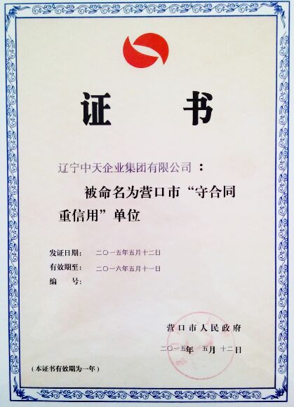 在激烈的市場競爭中,“誠信”是企業(yè)最大的品牌。中天集團自成立以來,始終注重加強企業(yè)的誠信建設(shè),堅持誠信為本、信用至上的發(fā)展原則,用誠信打動客戶、用誠信贏得市場,打造“誠信中天”的企業(yè)品牌。2015年,集團再次被評為市“守合同重信用”單位,這是中天集團多年來一直堅持守合同重信用工作,以誠信推動企業(yè)發(fā)展的結(jié)果;是對中天集團全體員工日常點點滴滴辛勤工作的溫情回報;更是社會各界對中天集團持續(xù)、穩(wěn)健發(fā)展的充分認(rèn)可與贊揚。