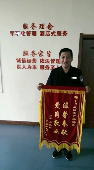 業(yè)主的家人回來后買來水果和煙想送給保安以示感謝,但被保安隊長李世剛婉拒。未曾想幾天后趙純超親自給物業(yè)送來一面錦旗,上面寫著“愛崗敬業(yè),溫馨奉獻”八個大字。趙先生說:“事情雖小,但讓我心里覺得很暖,感謝你們物業(yè)保安人員的幫助、熱心和大度。既然你們把我們業(yè)主當朋友,我也一定把你們當成一家人?!笨吹綐I(yè)主終于和物業(yè)敞開心扉,所有的付出得到認可,我們感到非常幸福。
