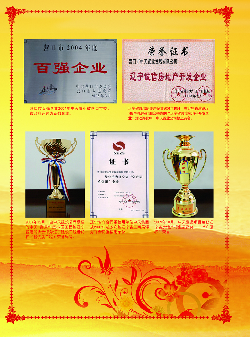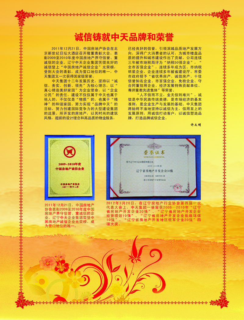 中天集團(tuán)連續(xù)十三載榮獲“市守合同重信用”企業(yè)榮譽(yù)稱號(hào)。“誠實(shí)守信”是一個(gè)企業(yè)在激烈的市場(chǎng)競爭中保持旺盛生命力和競爭力的根本,是建立市場(chǎng)經(jīng)濟(jì)秩序的基石,是企業(yè)可持續(xù)長遠(yuǎn)穩(wěn)健發(fā)展的保障。中天集團(tuán)成立至今,已建立起自身獨(dú)特的“誠信機(jī)制”,對(duì)業(yè)主說到做到,對(duì)客戶說到做到,與主管政府部門領(lǐng)導(dǎo)說到做到,嚴(yán)格按合同履行各項(xiàng)責(zé)任與義務(wù),“共贏互利、信守承諾”得到了社會(huì)各界的一致認(rèn)可與好評(píng),集團(tuán)也走出了屬于中天特色的發(fā)展之路。