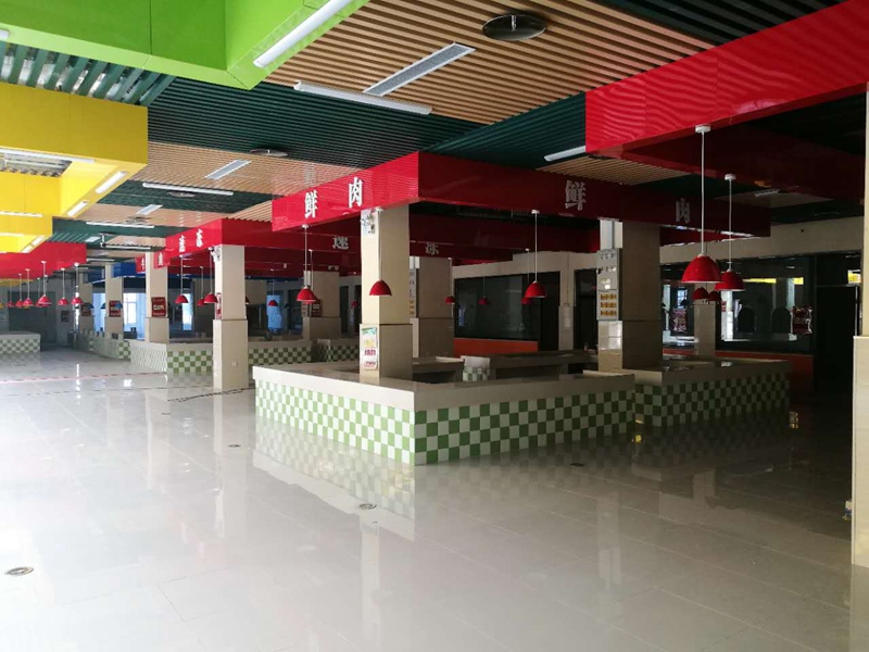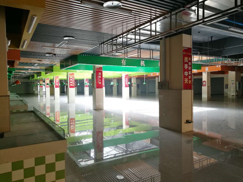 工程 – 在中天集團各建筑、裝飾公司所有員工夜以繼日的努力下,將工期縮短至3個月,地面鋪裝、吊燈安裝等現(xiàn)已全部安裝完畢,于2017年6月末市場一裝收尾工作正式結(jié)束,市場已完全具備開業(yè)條件。每位到訪的商戶走進中天農(nóng)貿(mào)超級市場,都對我們市場的高標(biāo)準(zhǔn)裝修風(fēng)格給予了極高的評價和肯定,同時也堅定了他們投資信心。隨著市場整體驗收的進行,預(yù)計8月初所有簽約商家即可進行商鋪二裝,市場定于9月中旬盛大開業(yè)。