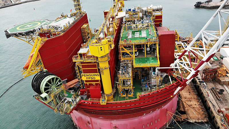 11月29日,一名工人在企鵝圓筒型浮式生產儲卸油裝置(FPSO)交付儀式上與吉祥物合影。