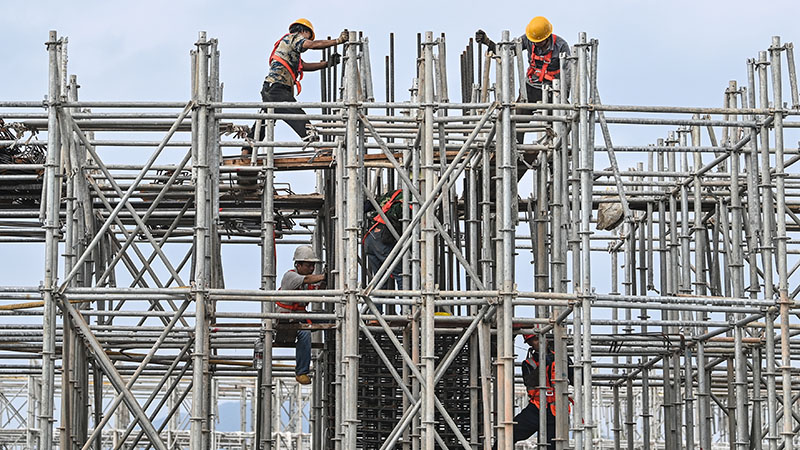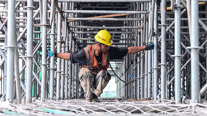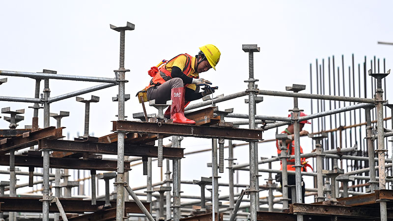 在玉林北站工地,工人在搭建站房鋼筋架(11月27日攝)。