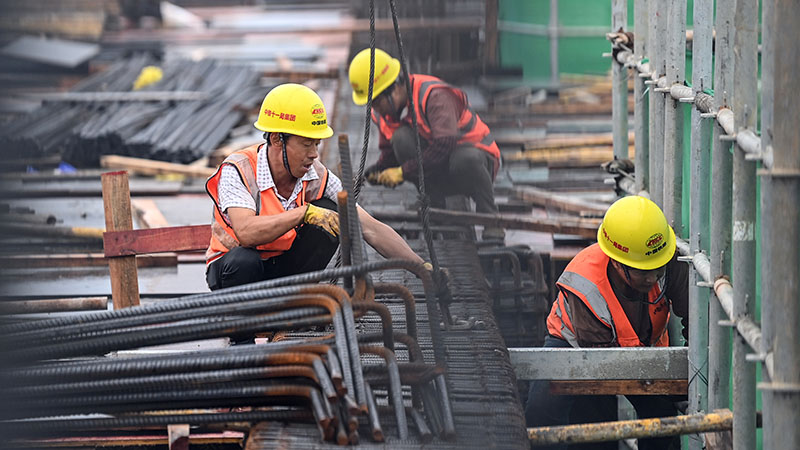 在玉林北站工地,工人在鋪設樓面鋼筋(11月27日攝)。