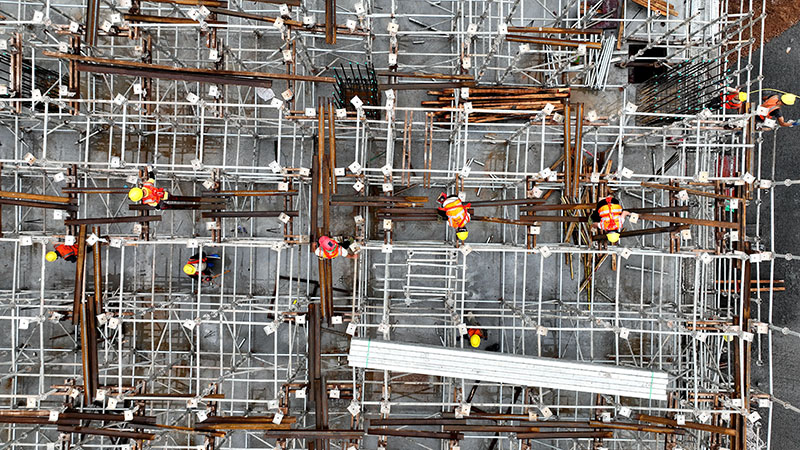 這是中鐵十一局的工人在玉林北站工地搭建鋼筋(11月26日攝,無人機照片)。